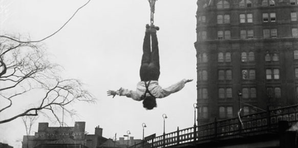 Houdini continued his career of escape by introducing the straitjacket escape into his routine. After obtaining a straitjacket and weeks of practice, Houdini was ready to try the trick on stage. He was buckled in, carried to a cabinet and then placed behind curtains. He had gained some slack by holding his crossed arms rigidly as the sleeve straps were fastened. Straining every muscle, a little at a time, he forced one sleeve and then other over his head. Then, he opened the straps with the pressure of his fingers through the canvas. He twisted, turned, and finally squirmed free. He threw off the restraint and burst through the curtains to take a bow.